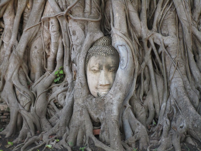 En el siguiente templo descubrimos una de las imágenes más populares de Buda en Tailandia: la cabeza de piedra de un buda rodeada por las raíces y ramas de una higuera.