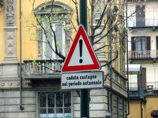 Me tropecé con esta señal en 2009 en una de las grandes avenidas de la ciudad italiana de Milán. Hasta ese momento no había advertido la amenaza que suponían las castañas para vehículos y viandantes.
