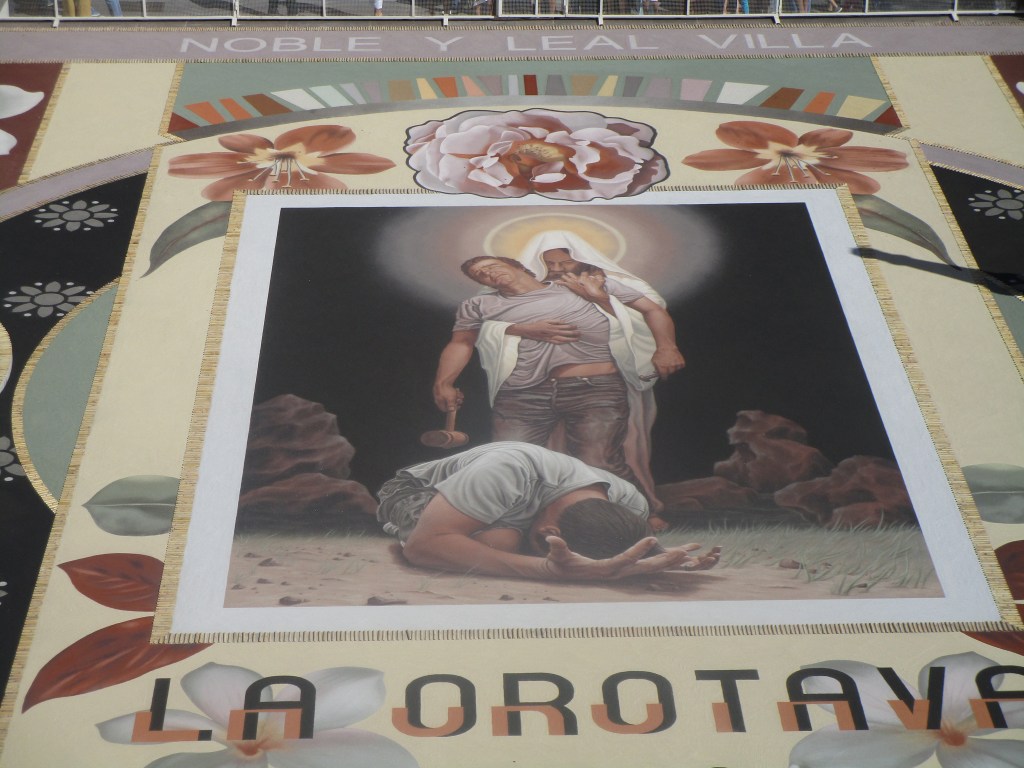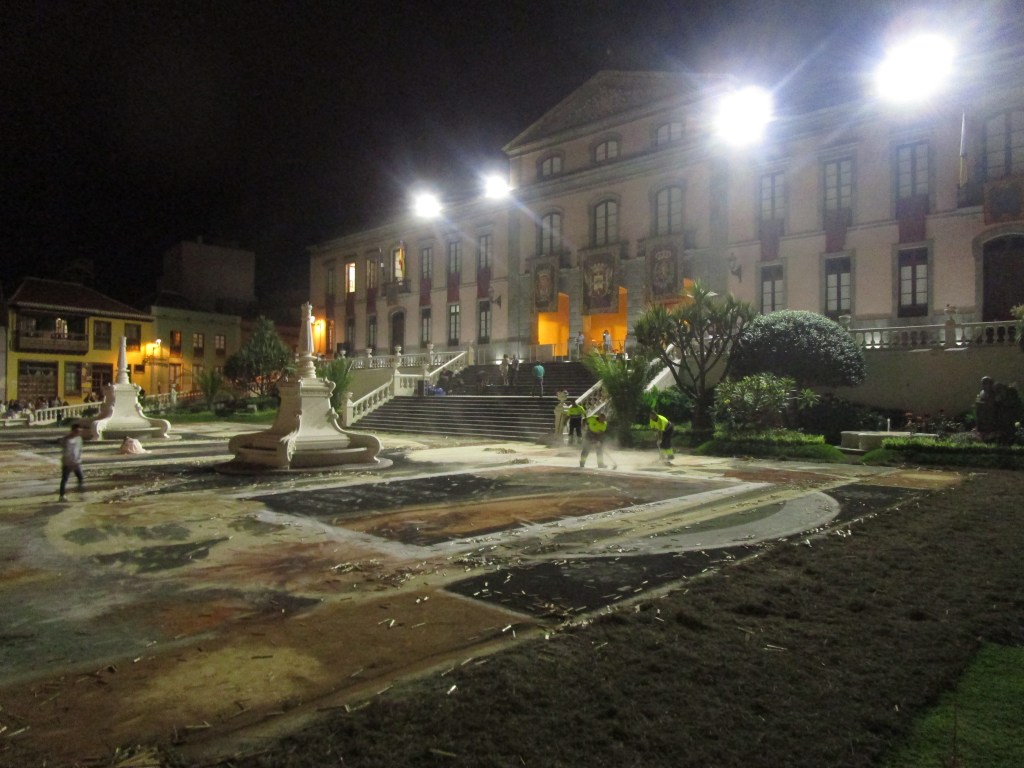 Desde primeras horas de la mañana la plaza del Ayuntamiento se convierte en un lugar de peregrinación. Todos quieren contemplar el extraordinario tapiz creado exclusivamente con arenas naturales del Parque Nacional del Teide que cubre los 900 metros cuadrados de la plaza. Es una fantástica y hechizante obra de arte. Tan grande que desde 2007 se encuentra en el libro Guiness de los Recórds por ser la mayor alfombra de arenas naturales del mundo.