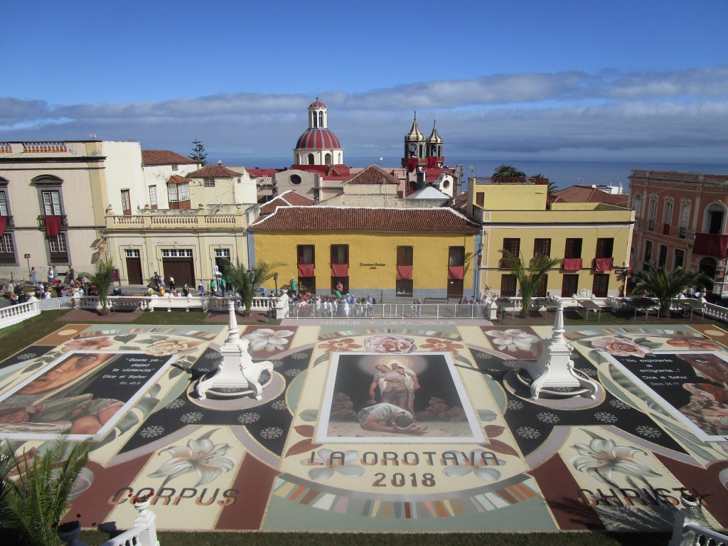 Madrid, Barcelona, San Antonio de Texas, Caracas, Roma, Londres, Oslo, Róterdam… todas estas ciudades han disfrutado del arte de los alfombristas villeros. En 1906, artistas orotavenses elaboraron una alfombra en Madrid a petición de la Casa Real con motivo del enlace entre Alfonso XIII y Victoria Eugenia de Battenberg. Otra alfombra excepcional fue la confeccionada en la plaza del Ayuntamiento de La Orotava en el año 1992 para recibir la antorcha olímpica que ese año viajaría hasta Barcelona.