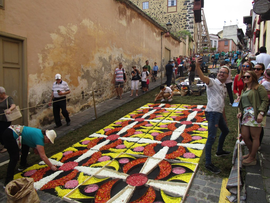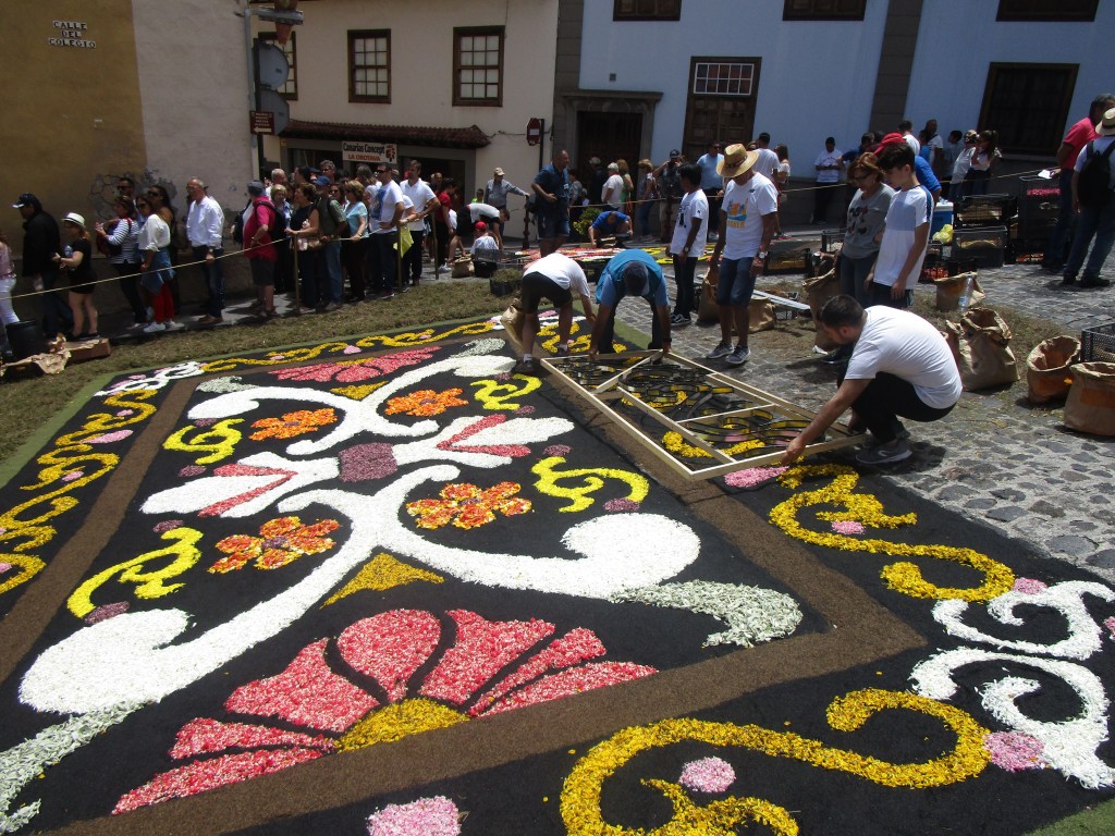 Al mismo tiempo que muchos admiran la deslumbrante obra desde los balcones del ayuntamiento, vecinos, estudiantes, familias y amigos confeccionan todos juntos magníficas alfombras de flores en los adoquines del casco histórico. Es impresionante presenciar en directo cómo todos ellos ponen tanto esmero y cariño en realizar verdaderas obras de arte que desaparecerán esa misma tarde al pasar sobre ellas la procesión del Santísimo Corpus Christi. Sin duda, uno de los mejores días para ver el alma artística de La Orotava.