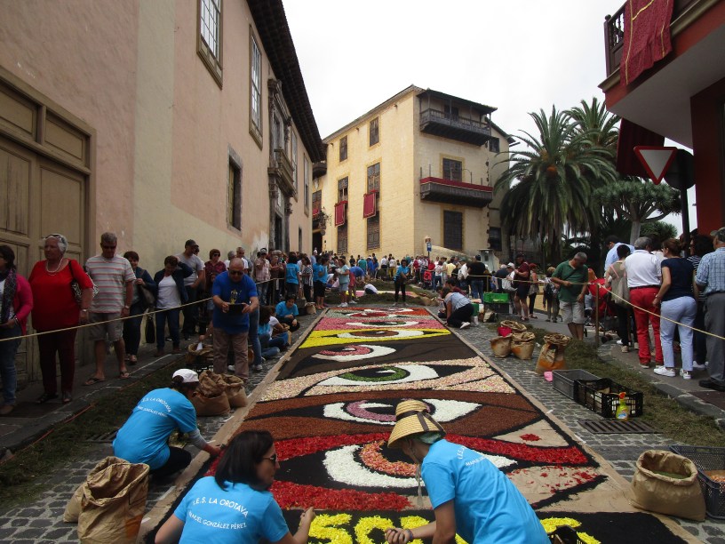 Al mismo tiempo que muchos admiran la deslumbrante obra desde los balcones del ayuntamiento, vecinos, estudiantes, familias y amigos confeccionan todos juntos magníficas alfombras de flores en los adoquines del casco histórico. Es impresionante presenciar en directo cómo todos ellos ponen tanto esmero y cariño en realizar verdaderas obras de arte que desaparecerán esa misma tarde al pasar sobre ellas la procesión del Santísimo Corpus Christi. Sin duda, uno de los mejores días para ver el alma artística de La Orotava.